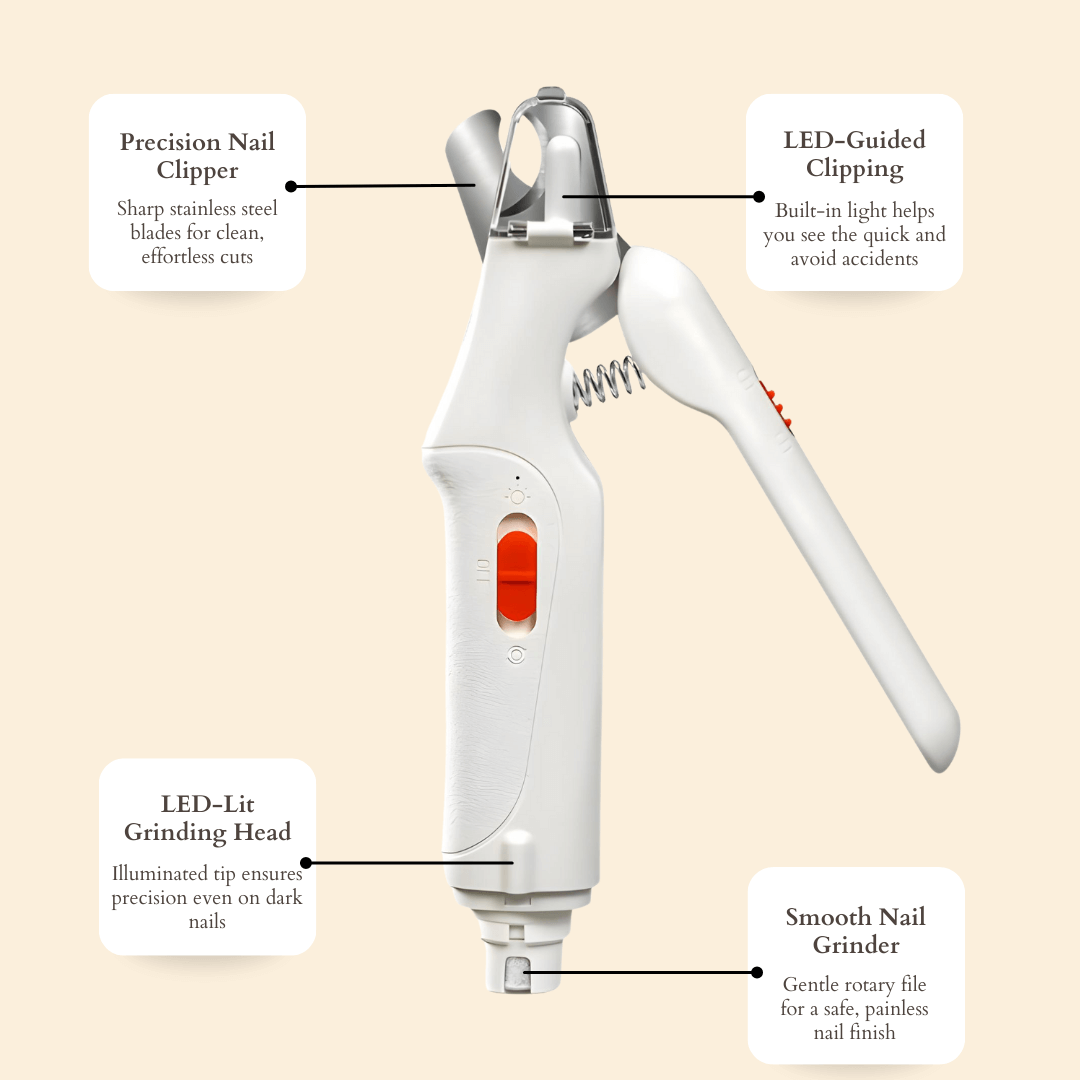 Use the LED light as a guide, trim just a little at a time, and keep styptic powder on hand. You can also use the grinder to smooth edges safely.